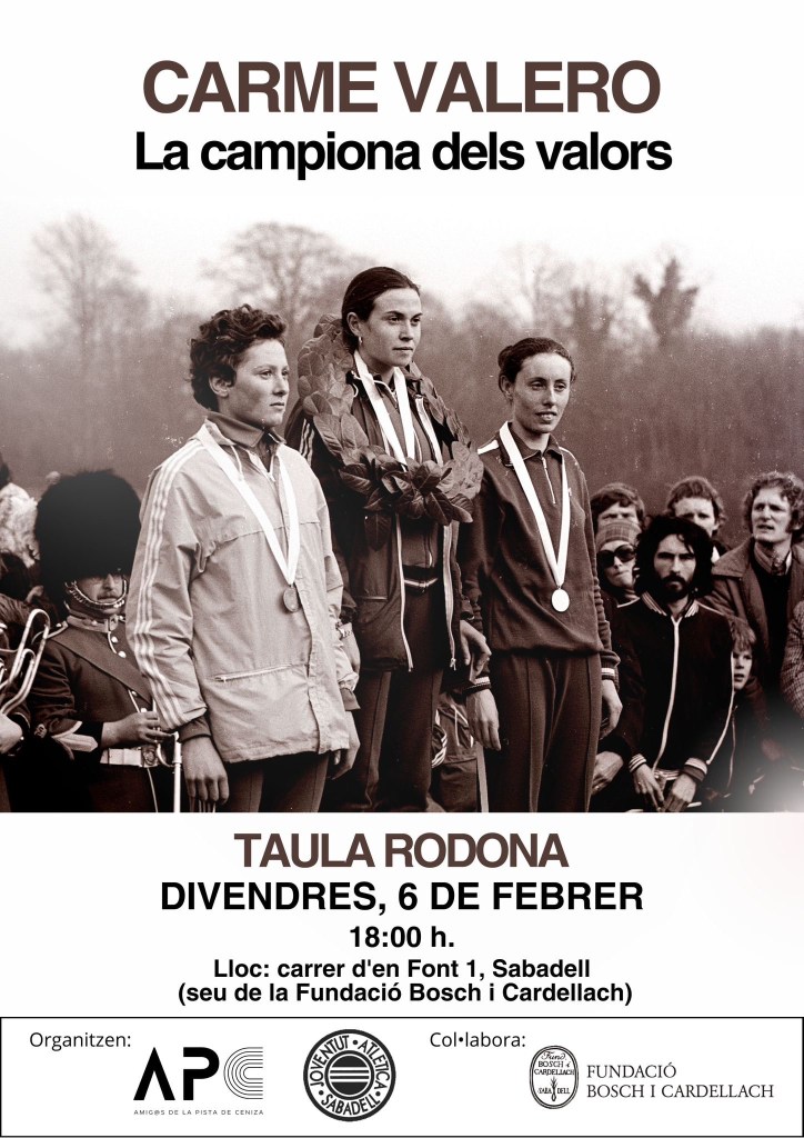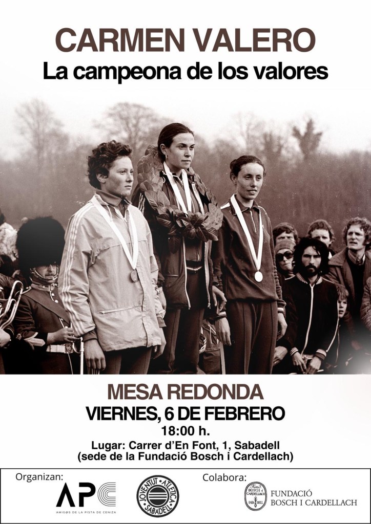 El próximo viernes 6 de febrero Sabadell acogerá la mesa redonda “Carmen Valero. La campeona de los valores”, un acto organizado por el grupo de Amigos de la Pista de Ceniza (APC) y la Joventut Atlètica Sabadell (JAS), con la colaboración de la Fundació Bosch i Cardellach, que quiere ser un homenaje sincero, cálido y profundamente humano a la mejor atleta española del siglo XX.