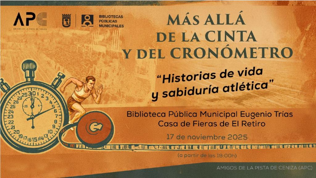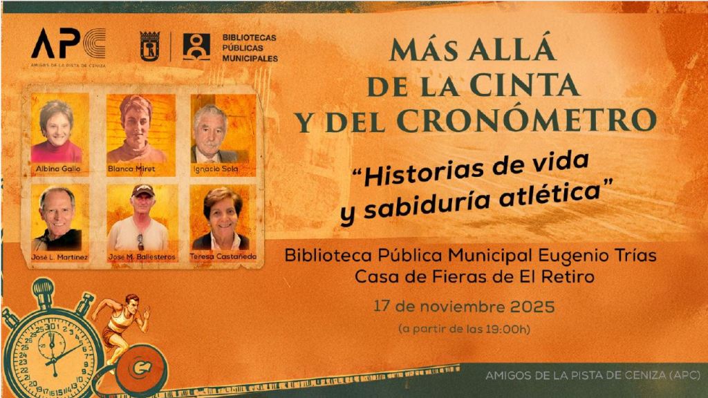 Con el precioso salón de actos de la Biblioteca Municipal Eugenio Trías de El Retiro de Madrid lleno hasta la bandera, el lunes 17 de noviembre se celebró la mesa redonda organizada por el grupo de Amigos de la Pista de Ceniza (APC) bajo el título “Más allá de la cinta y del cronómetro. Historias de vida y sabiduría atlética”.