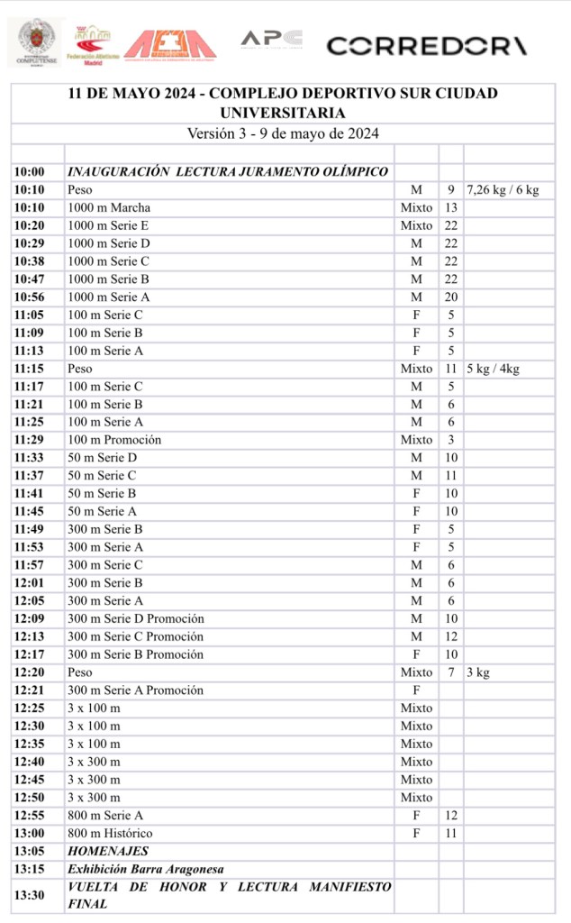 10:10 h. Inicio competiciones (1.000 metros marcha “Jesús Ángel García Bragado”; lanzamiento de peso “José Luis Torres”; 100 metros “Blanca Miret”; 300 metros “Jaime López-Amor”; 1.000 metros “Jorge González Amo”; Relevos “Múnich 1972” y Pruebas infantiles). Como gran novedad este año se disputará por primera vez el Triatlón Universitario “Bernardino Lombao” que englobará las pruebas de peso, 100 y 1.000 metros).